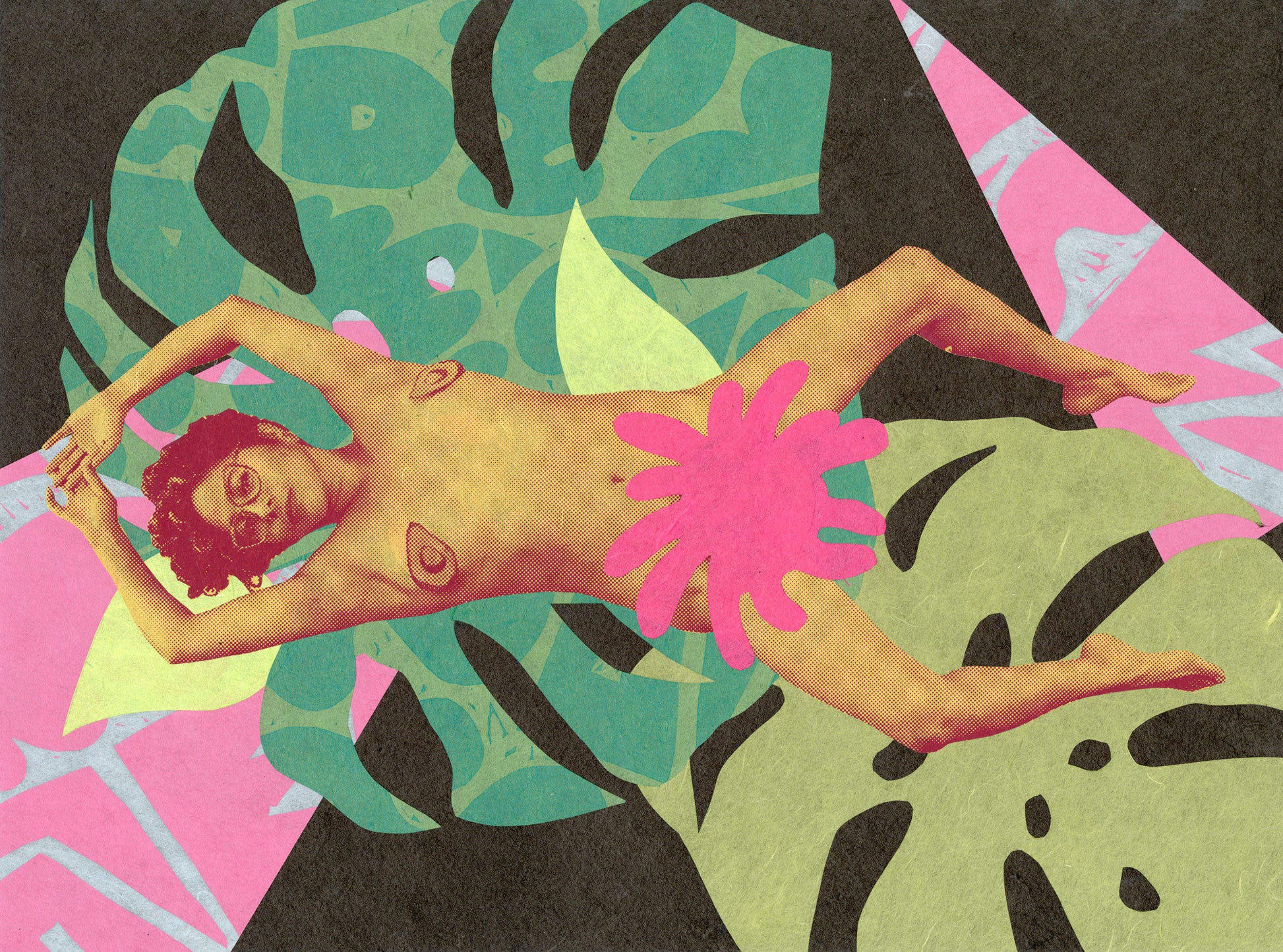Birth of the World is a new series of collages about pleasure and my human body. Colonization forces the human body into a small box, but the human body is an expansive and mysterious container. I am on a journey of re-wilding my relationship to my body and moving into integrity with the natural world around me. As part of that practice, I use my body and my art to unlearn negative messages that don’t serve me, so that I may embrace the wild and natural aspect of my being. I am fascinated by my body and all it can do.