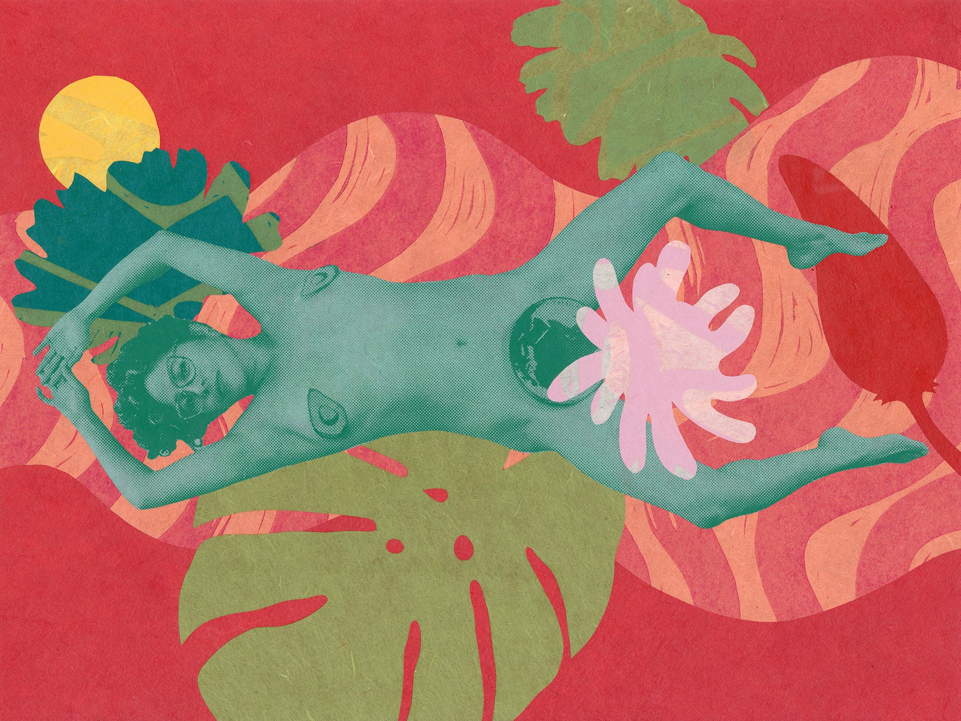 Birth of the World is a new series of collages about pleasure and my human body. Colonization forces the human body into a small box, but the human body is an expansive and mysterious container. I am on a journey of re-wilding my relationship to my body and moving into integrity with the natural world around me. As part of that practice, I use my body and my art to unlearn negative messages that don’t serve me, so that I may embrace the wild and natural aspect of my being. I am fascinated by my body and all it can do.