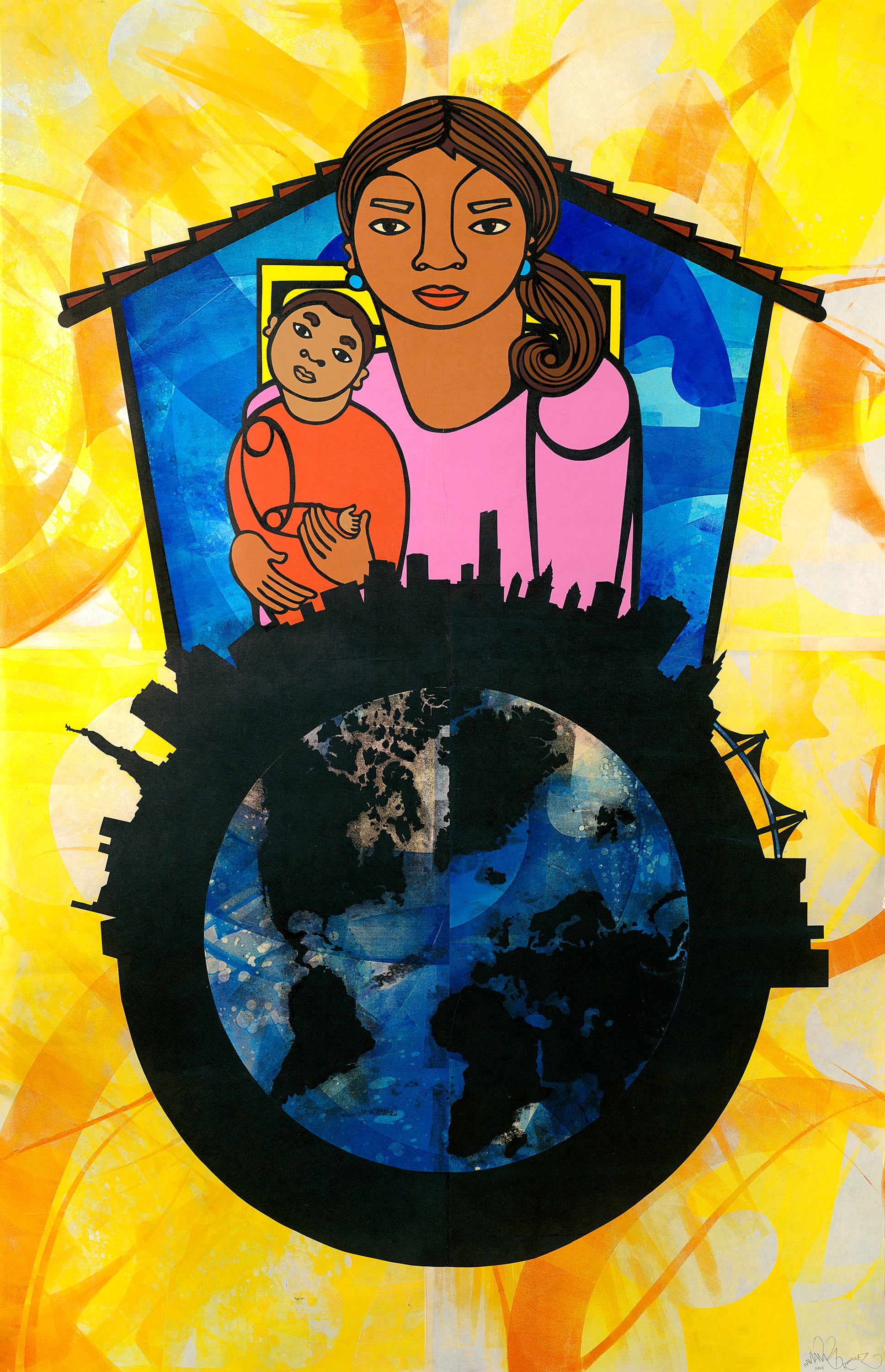 This oversize monotype collage depicts a woman of color with her child, standing with power and dignity in front of her home, ready to mobilize to defend mother earth. The image of the house is a metaphor for the places we call “home”, whether it’s our neighborhood, our earth itself. The human species only has one home in the entire galaxy, and it’s planet earth. I created this piece in the months leading up to the People’s Climate March in New York City as a way to encourage people to view earth the same way we view our home, to fight for our earth, and to defend her from the corporate forces that are destroying her and devastating wildlife, oceans, animals and human beings.