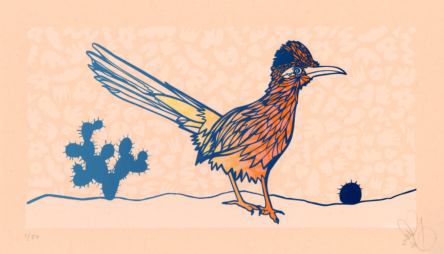 This screenprint pays tribute to the remarkable bird I encountered during my time in Arizona's stunning desert region.
