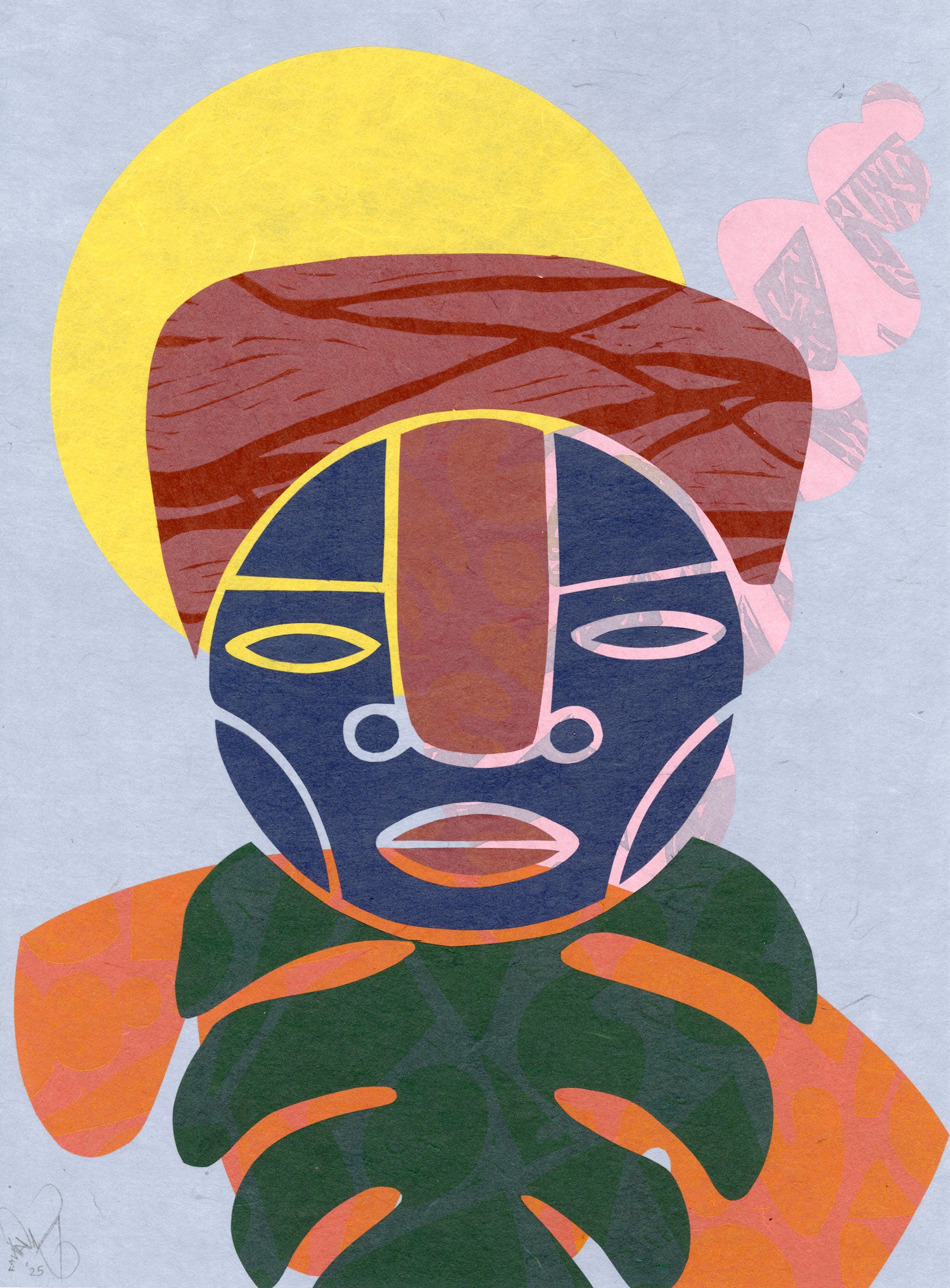 2025, Collage with Lino Block Elements on Cotton Rag Paper.