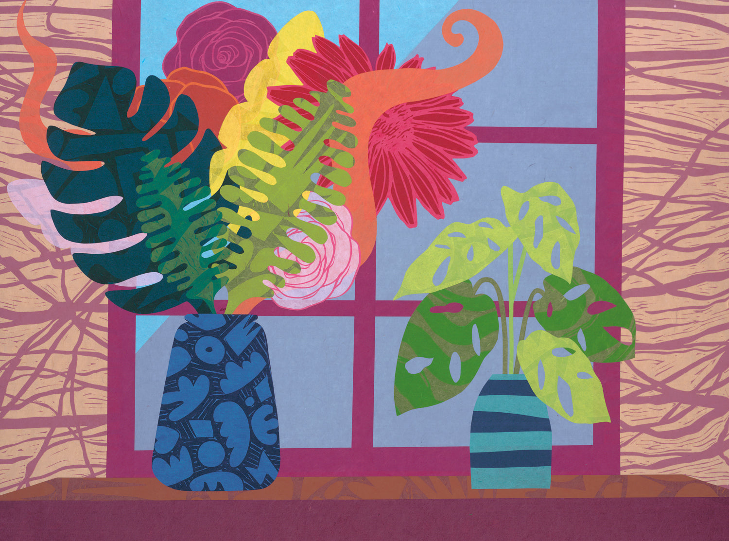 2024, Collage with Screenprint and Linoleum Block Elements on Cotton Rag Paper.