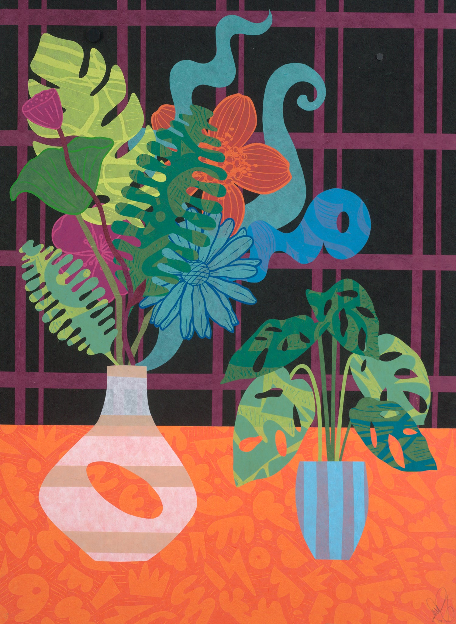 2024, Collage with Screenprint and Linoleum Block Elements on Cotton Rag Paper.