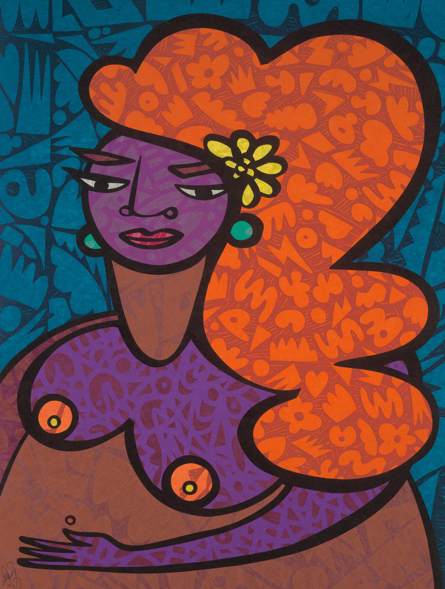 Black Velvet Majesty celebrates Fat Black Femmes in the world of pleasure activism and sex education. This person embodies confidence and ancestral wisdom, set against a cosmic backdrop with vibrant hair like a galaxy. With a gesture of self-love, they invite us to envision a world beyond ableism, racism, and fatphobia—a different dimension where they reign as a majestic force of nature.