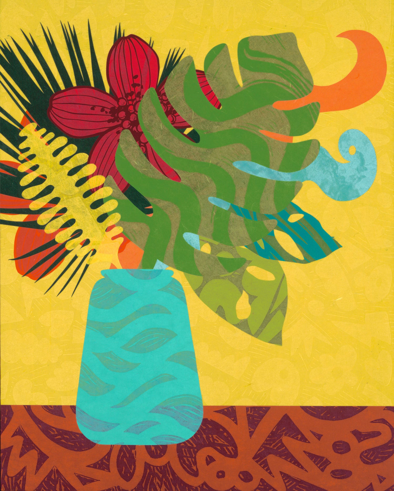 2024, Hanji collage with Screenprint and Linoleum Block elements on Wood Panel.