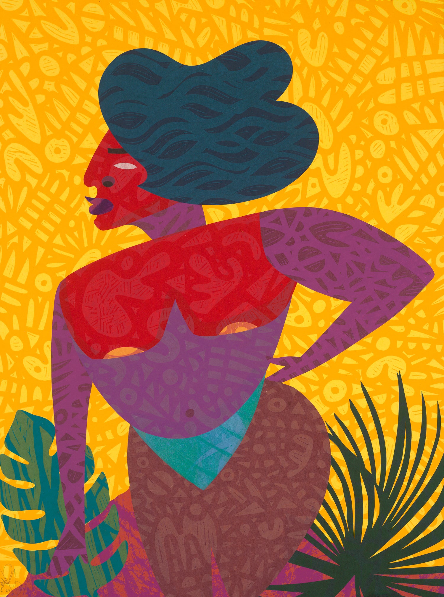 This collage series portrays a trans woman in a moment of serenity and contemplation, fully embodying her high femme power. Grounded in her truth, she is surrounded by lush green foliage, envisioning her future while celebrating the present.