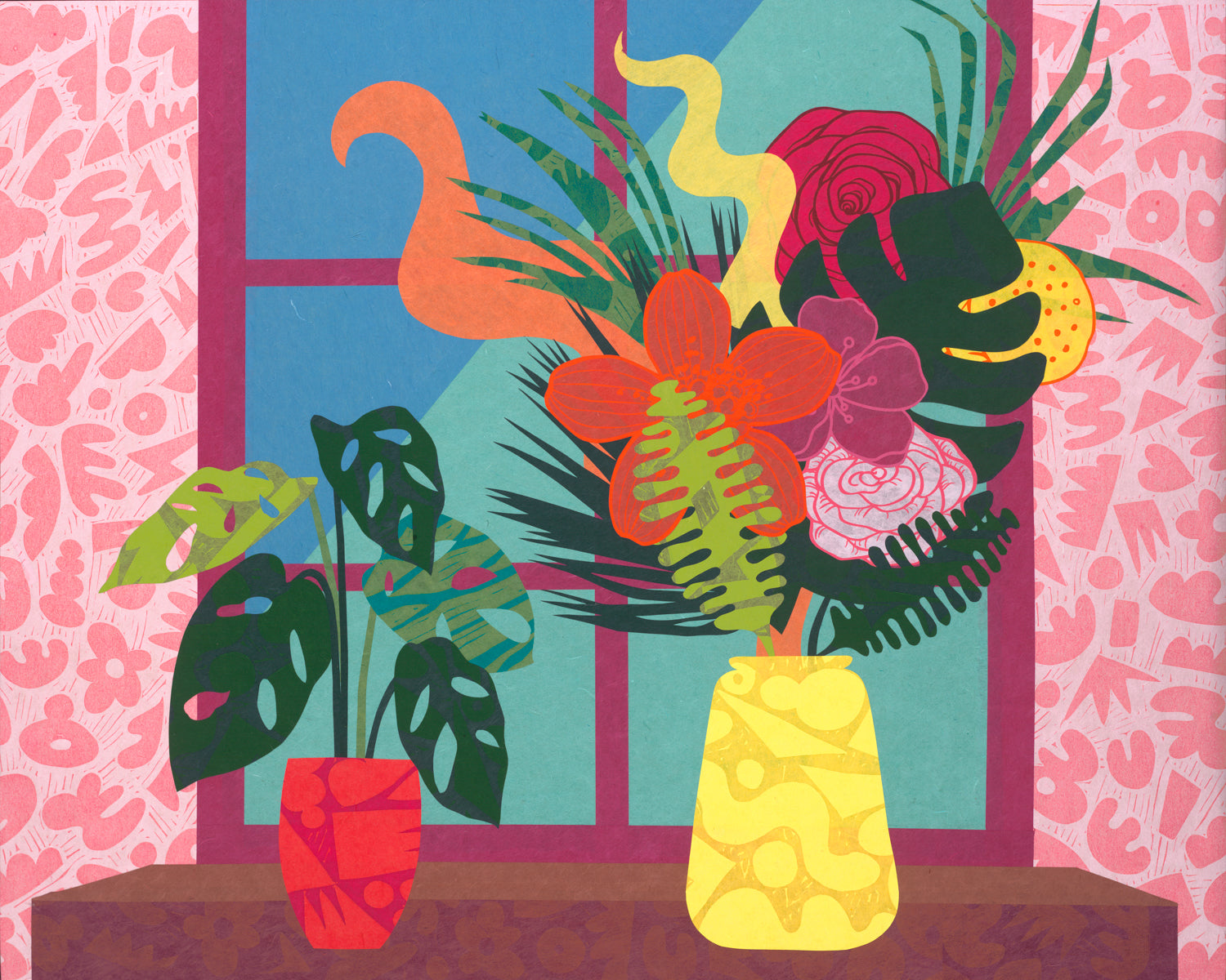 2024, Hanji collage with Screenprint and Linoleum Block elements on Wood Panel.