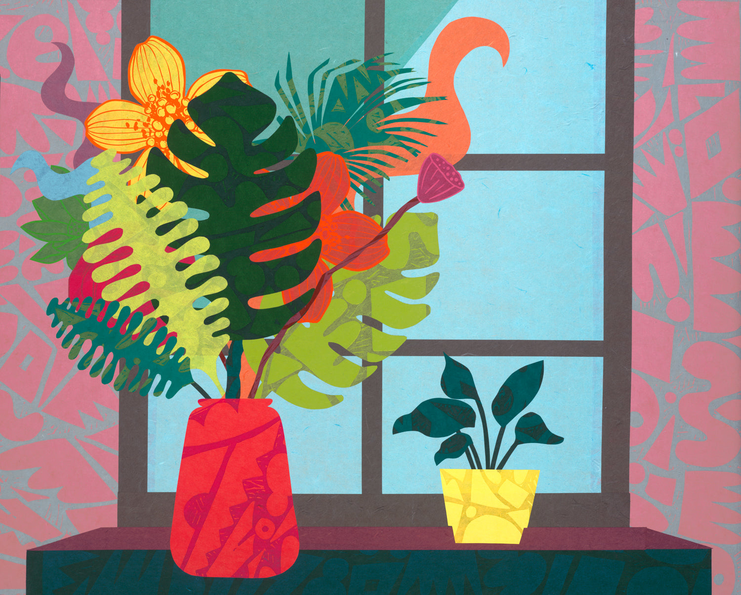 2024, Hanji collage with Screenprint and Linoleum Block elements on Wood Panel.